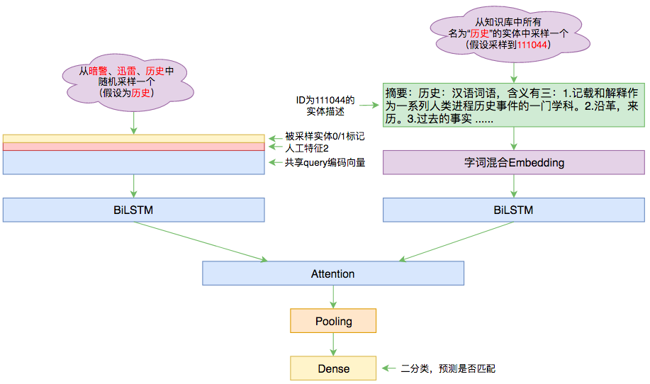 在实体链接的模型中,我们要做的事情是“判断 query 中的某个实体跟知识库中某个同名实体是否匹配”,为此,我们就需要随机采样:从 query 的所有识别出的实体中随机采样一个,然后从知识库里边所有同名实体中采样一个。
