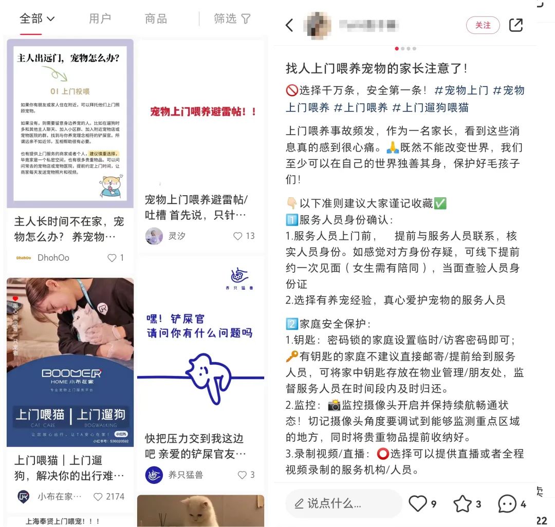 其他的上门服务也有这些问题,特别像上门喂宠这种主人基本不在场的情况,安全问题就很令人担心,小红书上搜上门喂宠除了自荐的帖子就是各种安全注意事项和避雷贴。
