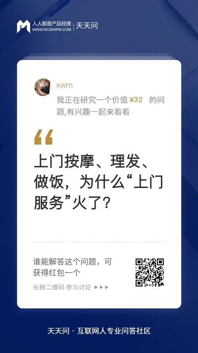 我们也和天天问的小伙伴们一起探讨了上门服务这个话题,本篇文章就来聊聊,上门服务为什么会火,它满足了消费者的什么需求,未来的发展又会怎样?