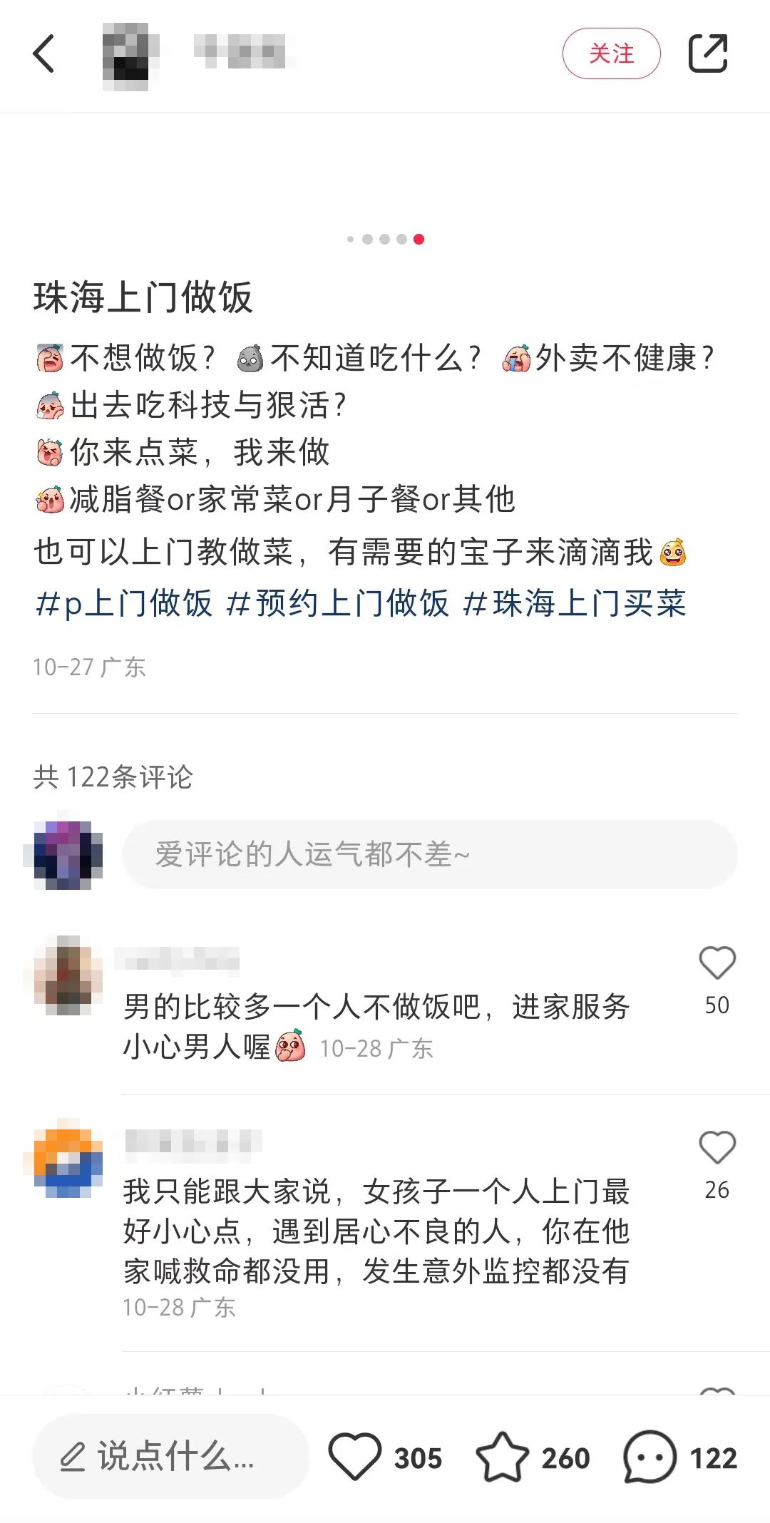 (小红书上对于上门做饭的安全担忧)