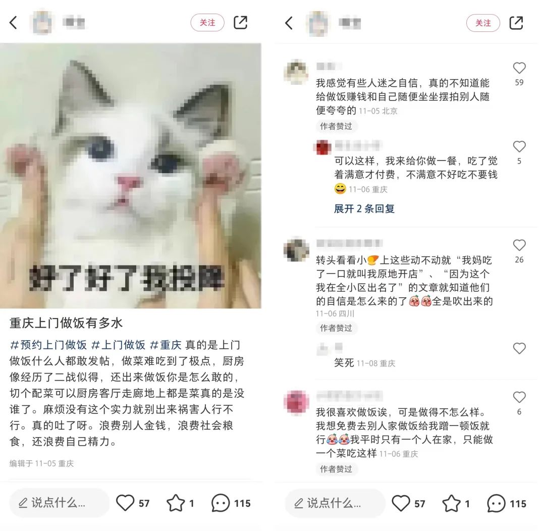 (小红书吐槽上门做饭的截图)