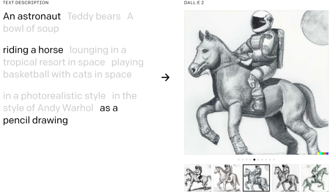 以往对于 DALL·E 2 的测试通常是把一些具体的物体组合成一幅图像,比如图像中包含「骑着马的宇航员」,DALL·E 2 轻松就能完成这个任务: