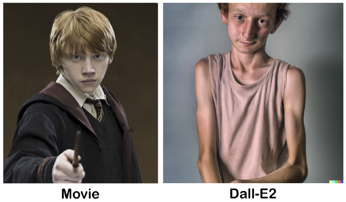 或许你觉得这两个形象大相径庭,并且因为艾玛 · 沃特森的颜值偏爱电影版一些,但不得不说,DALL·E 2 的生成结果是符合原著描述的。