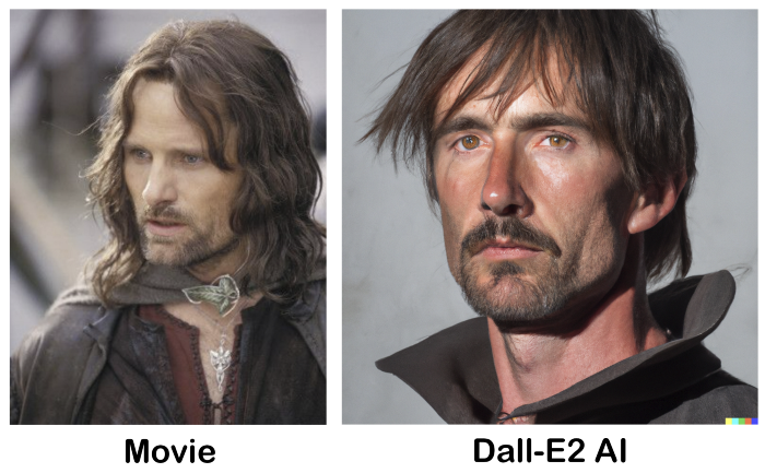 再看看另一个角色阿拉贡二世,不得不说,DALL·E 2 这次生成的形象俊朗了很多。原著对他的描写是:「蓬松的头发上点缀着些许银灰色,眼睛炯炯有神,与头发中的银色交相辉映。」