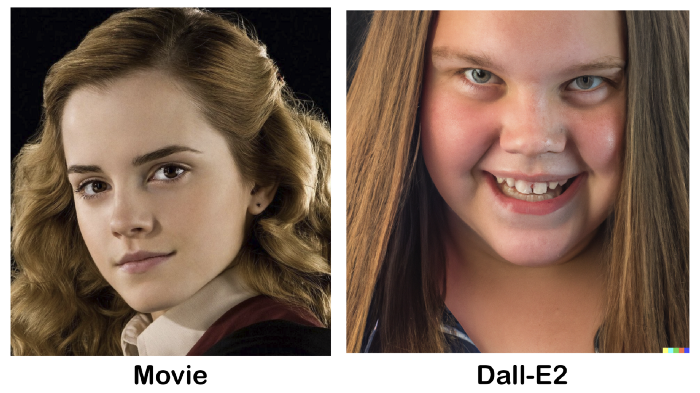 例如,《哈利波特》原著中对赫敏的形容是这样的:「一个声音霸道的女孩,她有一头浓密的棕色头发和相当大的门牙。」电影形象和 DALL·E 2 生成结果如下: