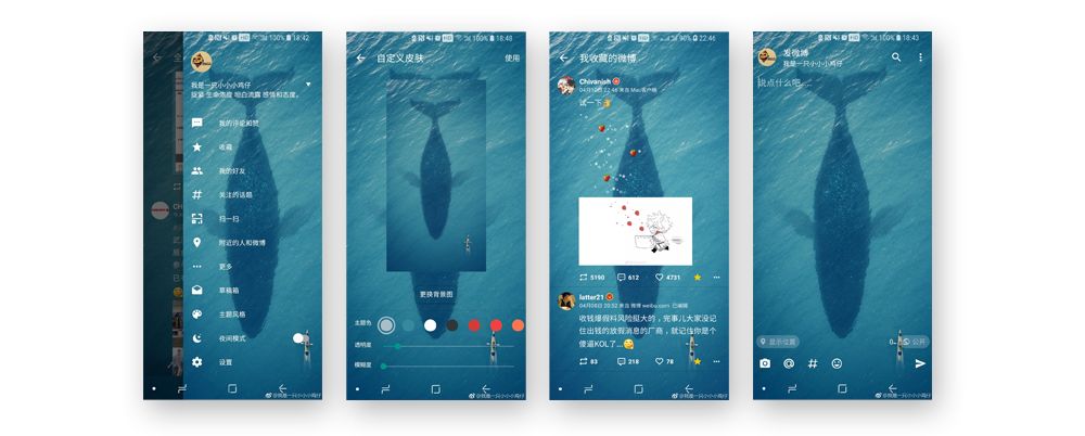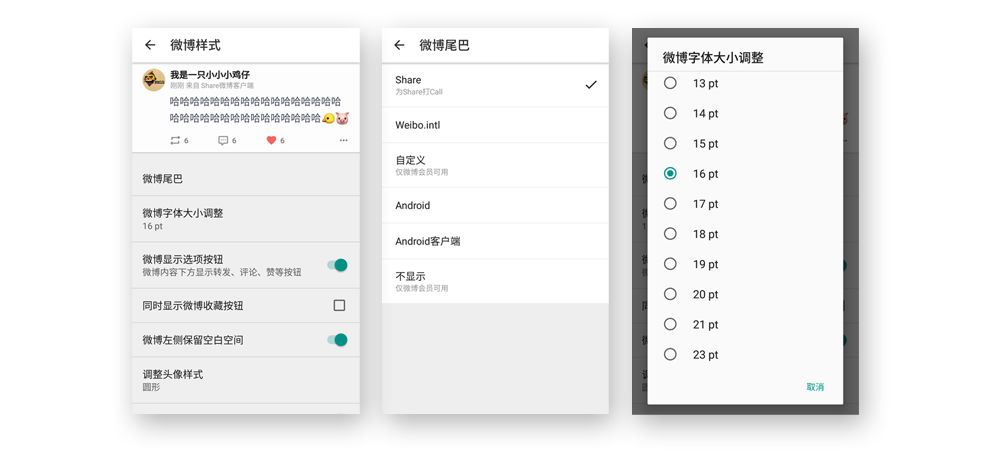 「Share」使用了 Material 的界面设计,UI 效果清新简约。为了提供更好的阅读体验,「Share」还提供了不少的对界面的个性化设置。微博尾巴、字体大小、是否显示评论的按钮、是否留白等功能都可以在后台中按自己的喜欢设置。