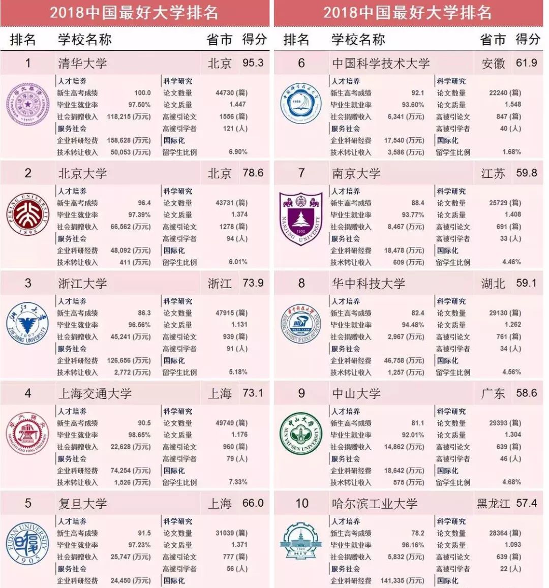 与 ARWU 排名相比较,不难发现,前十的排名中,前五名依然是清华、浙大、北大、上海交通大学、复旦大学,不过名次有些许变动,第六到第十名则变化大些,分别是、南京大学、武汉大学、华中科技大学、四川大学和吉林大学。