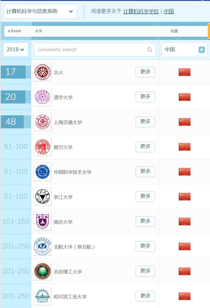 2 月 28 日,QS 也发布 2018 最新世界大学专业排名,在这里我们选取出中国内地计算机科学专业前十排名: