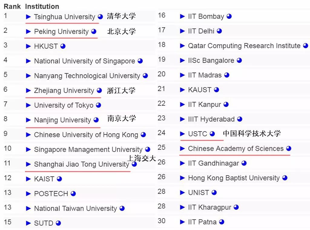 如果我们只考虑中国大陆的高校,按照名次的前后顺序,我们不难看出,排名依然是清华大学、北京大学、浙江大学、南京大学、上海交通大学、中国科学技术大学排名靠前,此外上榜的还有中国科学院