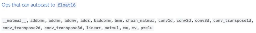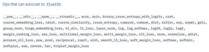 自动混合精度训练拼图的另一半是 torch.cuda.amp.autocast 上下文管理器。Autocast实现了 fp32-> fp16转换。回想一下“混合精度是如何工作的“中的内容,由于不同的操作以不同的速率累积误差,并非所有的操作都可以在 fp16中安全运行。下面的截图来自 amp 模块文档,介绍了autocast如何处理 PyTorch 中可用的各种操作: