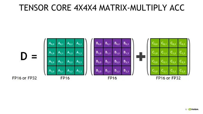 张量核是一种新型的处理单元,针对一个非常特殊的操作进行了优化: 将两个4 × 4 fp16矩阵相乘,然后将结果加到第三个4 × 4 fp16或 fp32矩阵(一个“融合乘法加(fused multiply add)”)中。