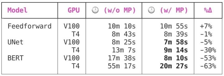 UNet 是一个中等规模的卷积模型,共有7,703,497个参数,从混合精度训练中得到了显著的好处。有趣的是,虽然 V100和 T4都受益于混合精度训练,但 T4的好处要大得多: 节省5%时间vs. 高达30%的时间。