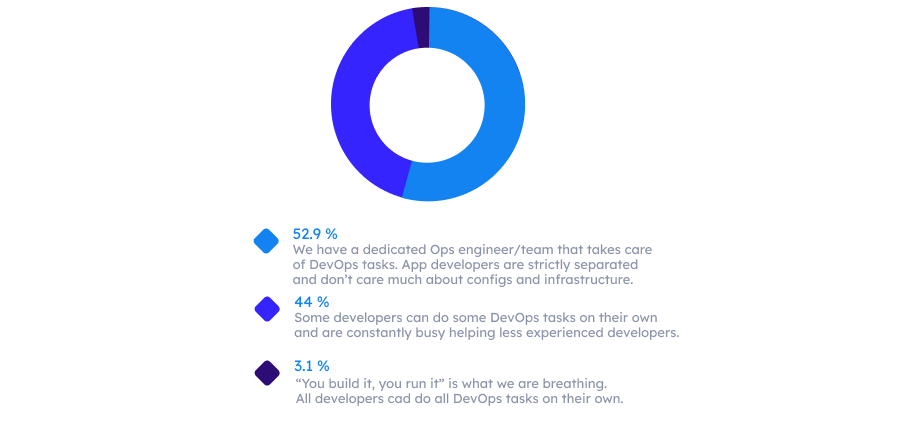 这类反模式已经为许多研究所证明,比如 Puppet 的 DevOps 现状报告或是最近 Humanitec 的基准测试研究。后面这份报告根据标准的 DevOps 指标(准备时间、部署频率、MTTR 等),对表现最好和最差的组织进行了分组。如下图所示,44% 的低效组织存在着上述反模式,有些开发人员要自己完成 DevOps 任务,并帮助经验不足的同事。与此相比,表现最好的组织全部成功实施了真正的“谁构建,谁运行”方法。