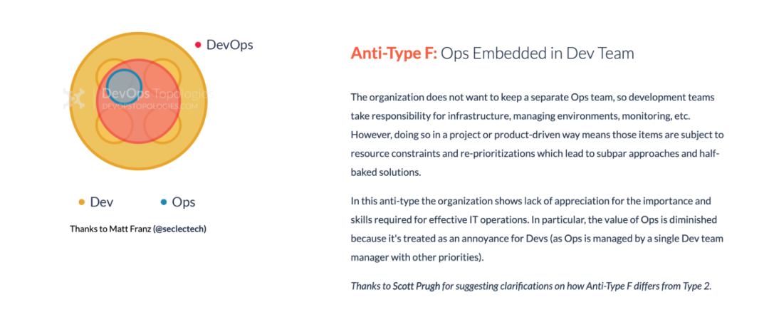 与此相反,当一个普通的工程组织试图实施真正的 DevOps 时,往往会出现一系列的反模式。我们通过一个例子来看下,当组织决定实施 DevOps 并取消正式的 Ops 角色或团队时,许多开发团队中出现了什么情况。开发人员(通常是比较资深的)最终承担起了管理环境、基础设施等的职责。这就导致了这样一种情况:“影子操作”由那些在编码和产品开发方面才能体现出最大价值的工程师来执行。没有赢家。高级工程师现在要负责设置,并需要处理比较初级的同事的请求。在组织层面,其最昂贵和最有才华的资源现在正在被滥用,他们无法再以同样的速度和可靠性来交付功能了。