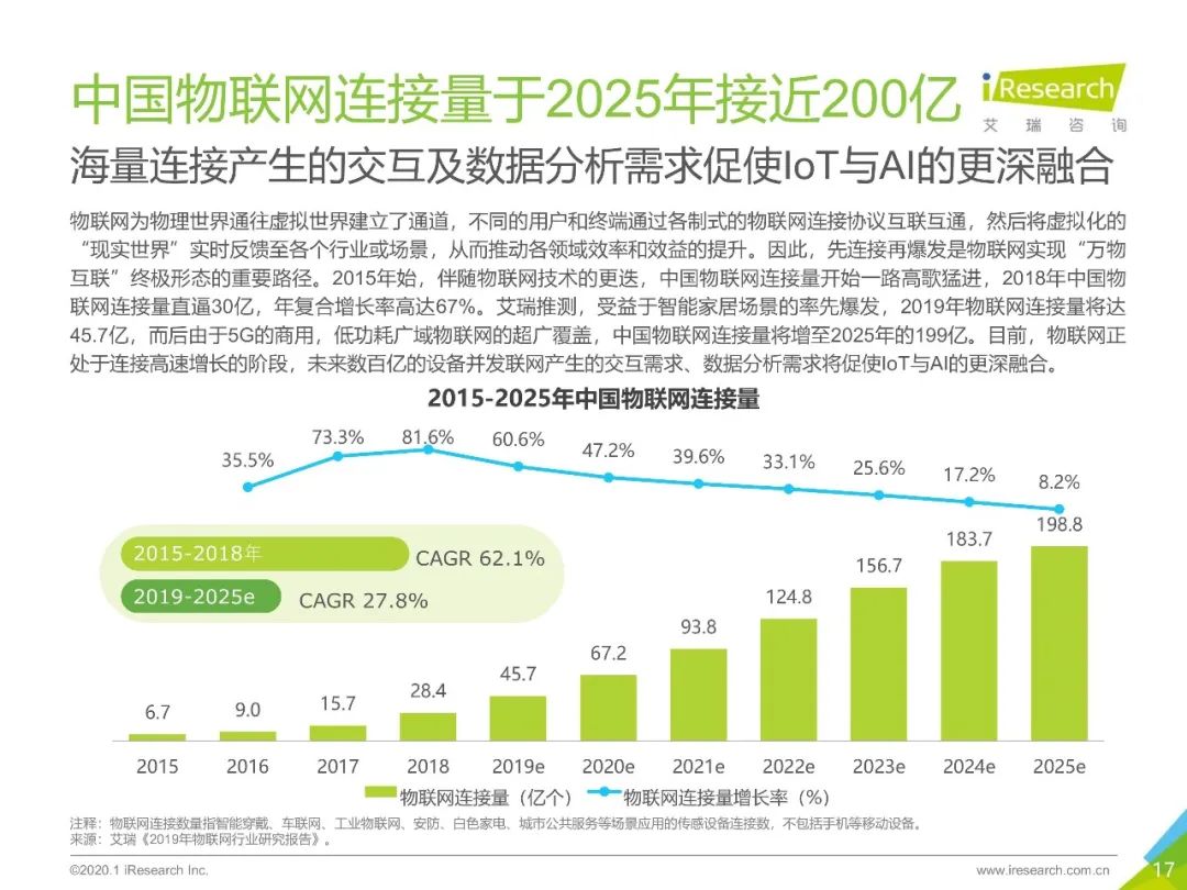 艾瑞推测,受益于智能家居场景的率先爆发,2019年物联网连接量将达45.7亿,而后由于5G的商用,低功耗广域物联网的超广覆盖,中国物联网连接量将增至2025年的199亿。目前,物联网正处于连接高速增长的阶段,未来数百亿的设备并发联网产生的交互需求、数据分析需求将促使IoT与AI的更深融合。