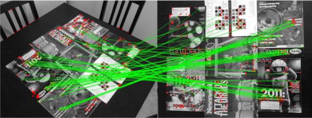 视角变化情况下的ORB特征点匹配结果。绿色连线表示有效的匹配对,红色圆圈表示未匹配的特征点。