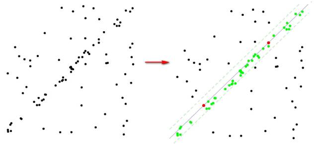 下图是RANSAC的一个示例,左边是所有的数据点,右边是RANSAC后的结果。