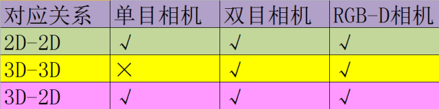 确定了特征匹配对,下一步就是根据这些特征匹配对估计相机的运动。根据 特征匹配对的不同维度(2D或3D),运动估计分为三种方法: