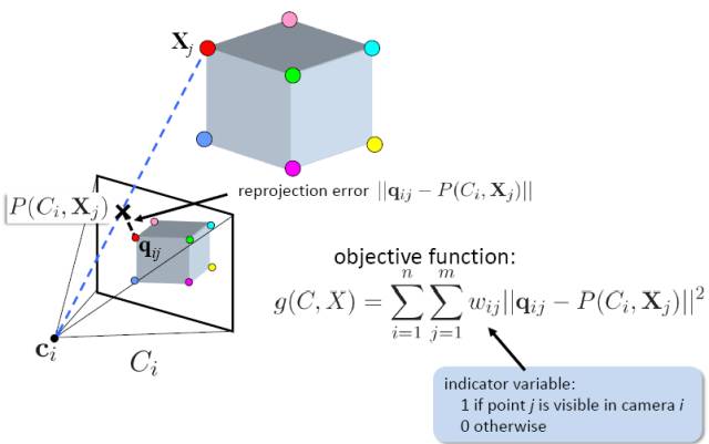 如下图所示,空间物体通过相机在图像平面所成像就称之为投影。下图中红色的qij特征点就是空间三维立方体(不是图上方的那个立方体,图中未画出)在图像平面的投影。然后我们利用前面所述的运动估计方法可以估计qij对应的可能的三维空间点位置(Xj点,不一定是真实的位置)。然后我们利用估计的三维空间点Xj和计算的相机参数Ci(不一定是真值)重新进行投影,此时投影到图像中的位置为P(Ci,Xj),由于估计位姿和相机参数时存在一定的误差,所以重投影点P(Ci,Xj)和第一次的投影qij有一定的偏差,就称为重投影误差。目标函数就是最小化这个重投影误差。