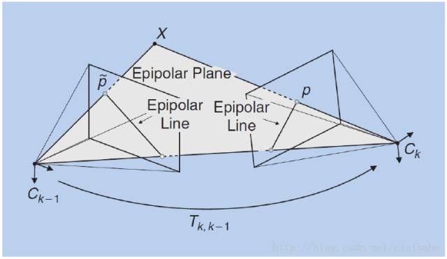 如图所示,空间点X和两个相机中心点Ck-1、Ck形成了3D空间中的一个平面,称为极平面(epipolar plane)。极平面和两幅图像相交于两条直线,这两条直线称为对极线(epipolar line)。从图中看如果已知了正确的特征点匹配对p,p',那么可以推断出三维点X的空间位置,以及相机的运动。