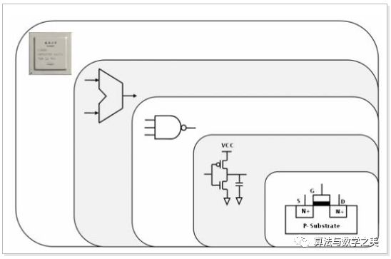在时钟的控制下,这些电流会经过 MOSFET 晶体管,晶体管中包含 N 型半导体和 P 型半导体,通过电压就能控制线路开闭,然后这些 MOSFET 构成了 CMOS,接着再由 CMOS 实现「与」「或」「非」等逻辑电路门,最后由逻辑电路门上就能实现加法、位移等计算,整体如下图所示(来自《计算机体系结构》):