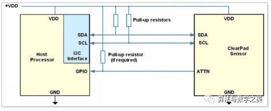 左边是处理器,右边是触摸屏控制器,中间的 SDA 和 SCL 连线就是 I²C 总线接口。