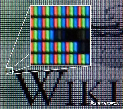 LCD 屏幕上的每个物理像素点实际上是由红、绿、蓝 3 种色彩的点组成,每个颜色点能单独控制,下面是用显微镜放大后的情况(来自 Wikipedia):