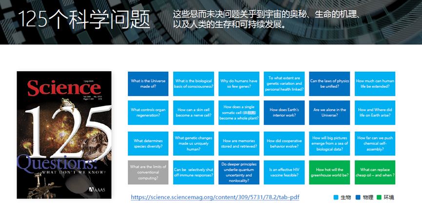 《科学》杂志在其成立125年周年的时候,发表了当前世界上最重要的125个现代科学问题,这些问题里绝大部分是关于生物学、物理学和环境科学的,这些问题关乎宇宙的奥秘、生命的起源以及人类的生存和可持续发展。我们相信,如果能够用机器学习、人工智能的手段推进这些问题,我们将有望打开通向未来的大门。