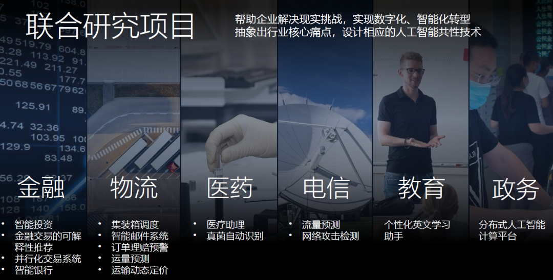 如何才能让人工智能实现更多的产业价值呢?为了寻求这个问题的答案,微软亚洲研究院于2017年成立了“创新汇”,与近50家各领域企业开展合作,进行了数百次的交流,完成了十余个联合研究项目。这些项目横跨金融、物流、医药、电信、教育、政务等多个行业。在开展这些联合研究的过程中,我们秉承着初心,不仅要帮助各个企业解决现实中的技术挑战,实现数字化、智能化转型;更重要的是从这些项目中抽象出行业的核心痛点,设计解决这些痛点的人工智能共性技术,为人工智能真正创造产业价值奠定基础。
