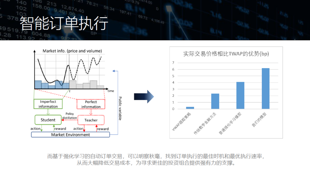 最后,订单的执行同样非常重要,但非常困难,因为在日内的整个市场波动更加剧烈,基于简单的规则去做订单交易,通常很难实现非常理想的平均交易价格。我们和合作伙伴一起探索了用强化学习的方法来做自动订单交易,这种方法可以在非常细的粒度下明察秋毫,找到执行订单的最佳时机和最佳执行速率,从而大幅度降低交易成本,获得良好的预期平均交易价格。一旦投资机构可以非常好地控制交易成本,那么久可以为寻找最佳投资组合创造更大空间,从而有更加亮眼的表现。