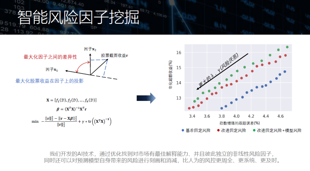 同样,关于风险控制,这是一个非常持久且重要的话题,只有我们对风险有了非常好的控制,才能实现稳定的投资。虽然这个话题很重要,但是在历史上人们对风险因子的研究道路崎岖、发展缓慢。历史的做法通常是,由专家定义出少量用来解释当前市场的因子,然后考察特定投资组合在这些因子上的暴露情况。从经典的 CAPM 模型发展到 Fama TFM 模型历时31年,仅增加了 Value、Size 几个少量的因子。而从 Fama 模型进化到当前大多数投资机构都在使用的 BARRA 模型,又经历了20年,也不过只增加了成长、动量等少数因子。而人工智能则可以通过优化的手段,自动找到对市场有最佳解释能力并且彼此相互独立的非线性风险因子,同时还可以对预测模型自身带来的风险进行刻画和消减。这样一来,我们用人工智能的手段去做风控,就可以比人类专家更周全、更系统、更及时。
