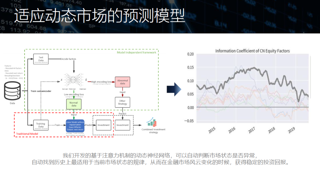针对市场动态性方面的挑战,微软亚洲研究院开发了一套基于注意力机制的神经网络,它可以自动判断当前市场是否处于异常状态。如果异常,我们就会建议投资机构采取一些被动的投资手段。如果这个市场在历史上似曾相识,我们就会利用注意力机制,从历史数据里寻找到最适用于当前市场的信息,通过数据或规律,让投资机构能够在金融市场的风云变幻之下,总是立于风口浪尖上,获得稳定的投资回报。