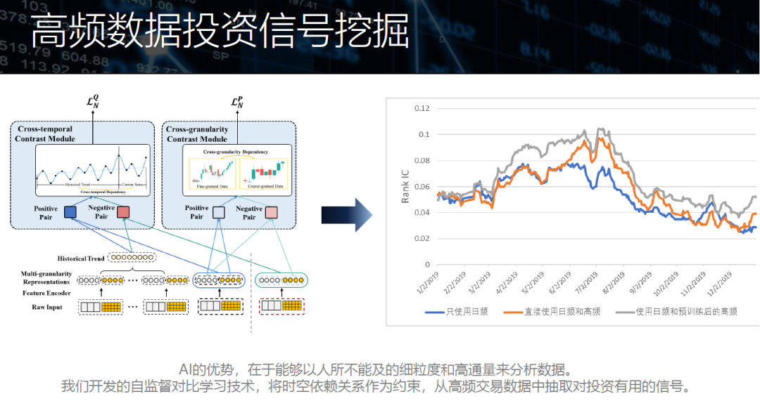 人工智能的优势在于能够以人所不能及的细粒度和高通量分析数据。当我们面临的数据是高频数据时,需要处理的就是抑制噪声,并从海量数据里抽取有用信息。以此为目的,我们研发了一套自监督对比学习技术,它将时空的依赖关系作为约束,去其糟粕,取其精华,希望能够从高频数据中抽取有效信号。当我们使用这种自监督对比学习的方法后,与只使用日频数据或者使用高频和日频结合的数据相比,新方法都有更好的表现,能够获得稳定的信号。