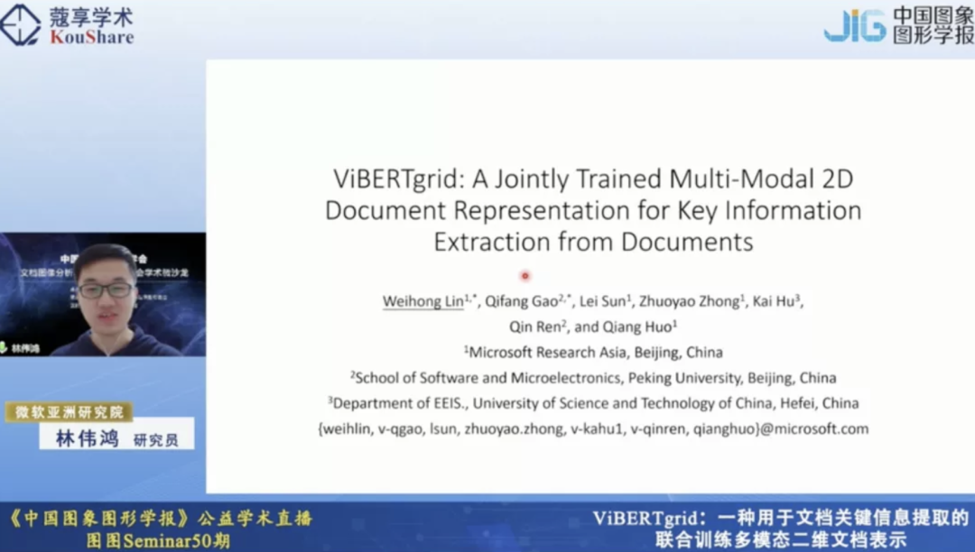 CSIG文档图像分析与识别专业委员会学术微沙龙(简称:文档图像微沙龙)在线学术报告会第三期于2021年11月2日成功举行。本沙龙由中国图象图形学学会主办,文档图像分析与识别专委会发起承办,中国图象图形学报协办。本期活动邀请微软亚洲研究院林伟鸿研究员分享报告:ViBERTgrid:一种用于文档关键信息提取的联合训练多模态二维文档表示。微沙龙活动在B站、蔻享学术,中国图像图形学报视频号进行了同步直播,人气峰值近4000。