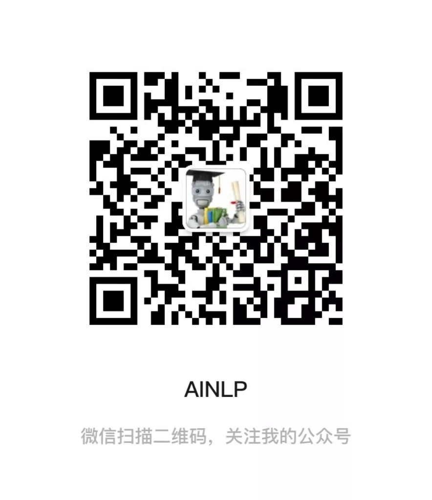 欢迎大家关注AINLP公众号,加入AINLP技术交流群(添加微信id:AINLP2,备注加群目的(技术交流、求职、直招),一起维护一个NLP技术交流环境。