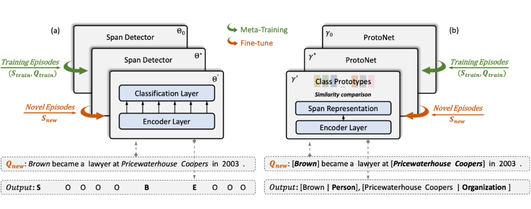 为了解决这些局限性,本文提出了一种分解的元学习方法,将原问题分解为跨度预测和实体分类两个过程。具体来讲: