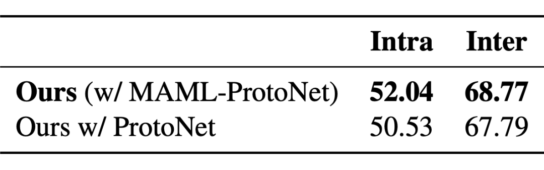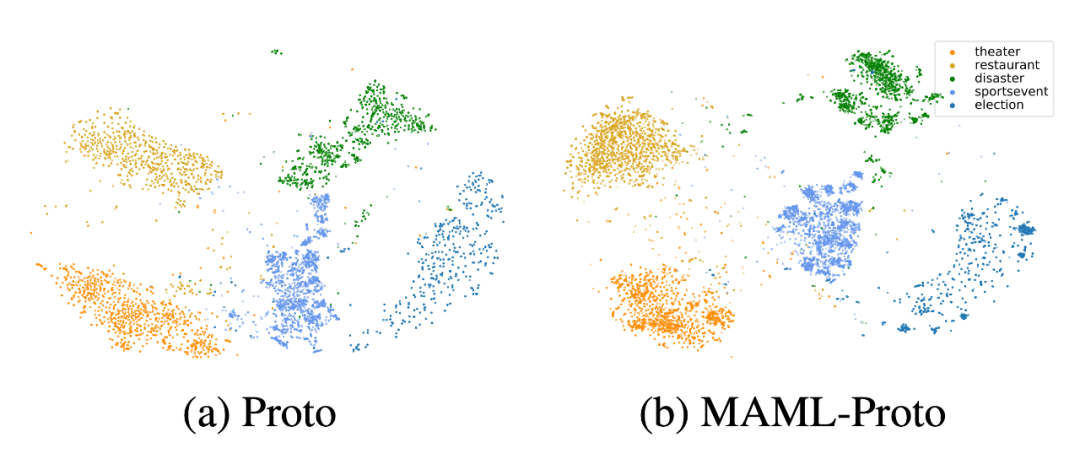 从上图可以看出,MAML 增强的原型网络能够更好的区分各个类原型。