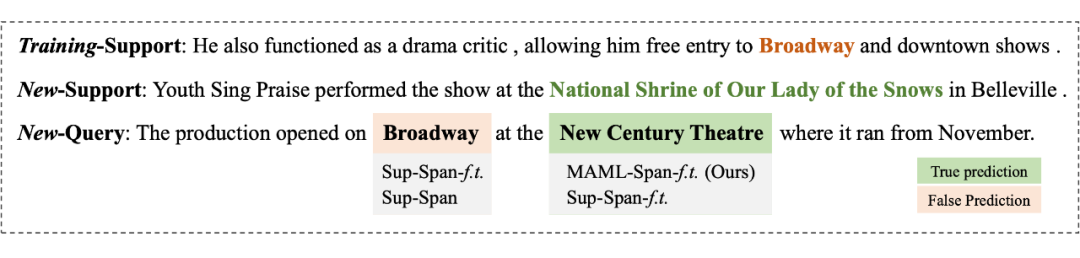 作者分析,未精调的模型预测的 Broadway 对于新实体类来说是一个错误的预测(Broadway 出现在了训练数据中),然后通过对该模型采用新实体类样本进行精调,可以看出模型能够预测出正确的跨度,但是 Broadway 这一跨度仍然被预测了。这表明传统的精调虽然可以使模型获取一定的新类信息,但是其还是存在很大偏差。