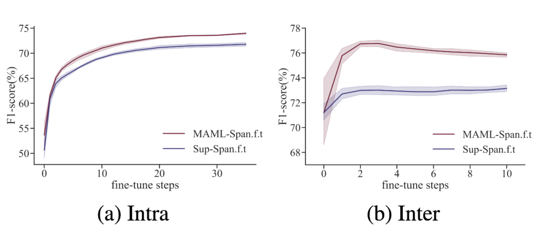 跨度检测阶段不需要分类具体的实体类,因此模型的参数可以在不同的领域之间共享。基于此,我们采用 MAML 来促进领域不变的内部表征学习而不是针对特定领域特征的学习。这种方式训练的元学习模型对于目标域的样本更加敏感,因此只需要少量样本进行微调就能取得很好的效果而不会过拟合。