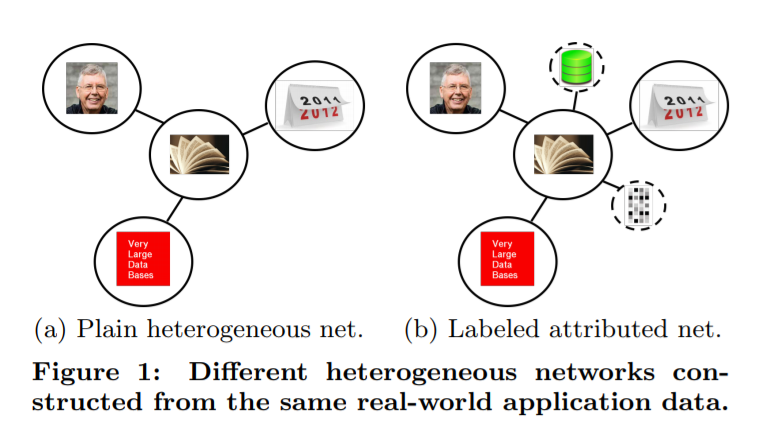 网络和图形构成了一种规范的、普遍存在的交互对象建模范式,已经引起了各个科学领域的重要研究关注[59、30、24、3、89、87]。然而,现实世界的对象和交互通常是多模态和多类型的(例如,作者、论文、场所和出版物网络中的术语[69,65];基于位置的社交网络中的用户、地点、类别和gps坐标[101,91,94];以及生物医学网络中的基因、蛋白质、疾病和物种[38,14])。为了捕获和利用这种节点和链路的异构性,异构网络被提出并广泛应用于许多真实的网络挖掘场景中,如基于元路径的相似度搜索[70、64、92]、节点分类和聚类[18、20、11]、知识库补全[68、48、103]和推荐[23、106、31]。