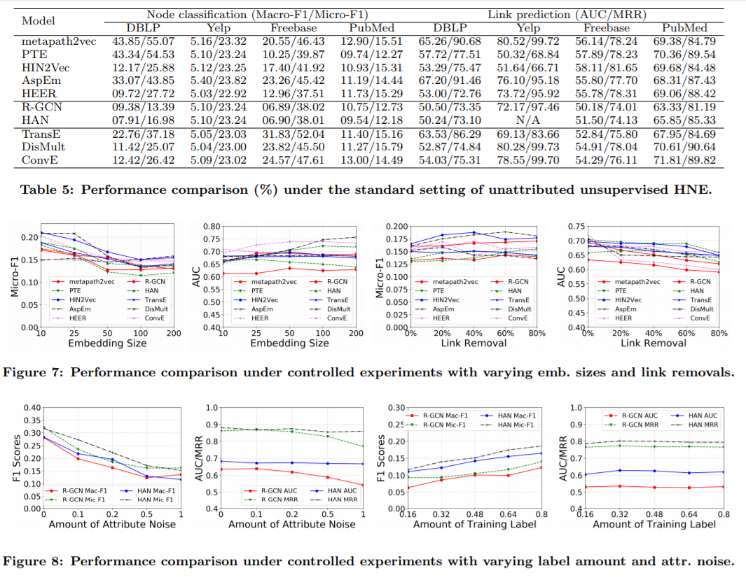 作为第三个贡献,许多现有的HNE算法(包括一些非常流行的算法)要么没有一个灵活的实现(例如,硬编码的节点和边缘类型、固定的元路径集等),要么不能扩展到更大的网络(例如,在训练期间的高内存需求),这给新的研究增加了很多负担(例如,,在正确的重新实现中需要大量的工程工作)。为此,我们选择了10种流行的HNE算法,在这些算法中,我们仔细地重构和扩展了原始作者的实现,并为我们准备好的数据集的插件输入应用了额外的接口(第5节)。基于这些易于使用和有效的实现,我们对算法进行了全面的经验评估,并报告了它们的基准性能。实证结果在提供了与第3节的概念分析相一致的不同模型的优点的同时,也为我们的基准平台的使用提供了范例,以供今后对HNE的研究参考。