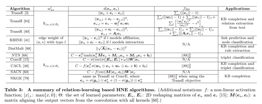 异类网络中的每条边都可以看作是一个三元组(u, l, v),由两个节点u, v∈v和一个边缘类型l∈TE(即。,实体和关系,用KG表示)。关系学习方法的目标是学习一个评分函数sl(u, v),该函数对任意三元组求值并输出一个标量来度量该三元组的可接受性。这种思想在KB嵌入中被广泛采用。由于已经有关于KB嵌入算法的调查[81],我们在这里只讨论最流行的方法,并强调它们与HNE的联系。