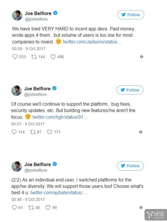 既然“名存实亡”的态势已经无法逆转,那么我们还是希望能够从中找到一些它之所以会失败的原因。对此,Joe Belfiore给出的回应是尽管微软花了很多钱请开发者为Windows 10 Mobile研发应用软件,甚至开发者不愿意参与时,亲自开发应用,但由于用户体量太小,很多公司都不愿意投资。再加上手机产业竞争的日趋激烈,口碑与销量上已经颓势尽显的WP在面对 iOS 与 Android 这两大阵营的围追堵截时更是难以招架。