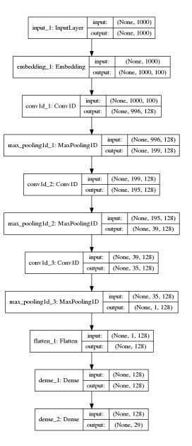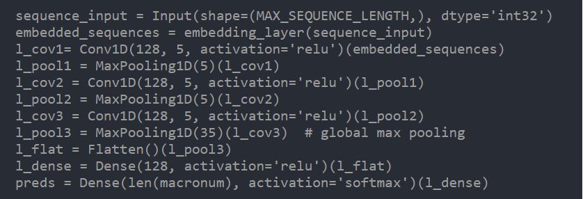 对于未知的单词,下面的代码会随机初始化它的向量。下面是一个非常简单的卷积结构,总共使用了128个大小为5的卷积核,窗口大小为5与35的最大池化,遵循该博客中的示例。