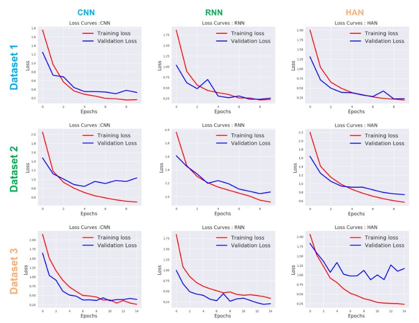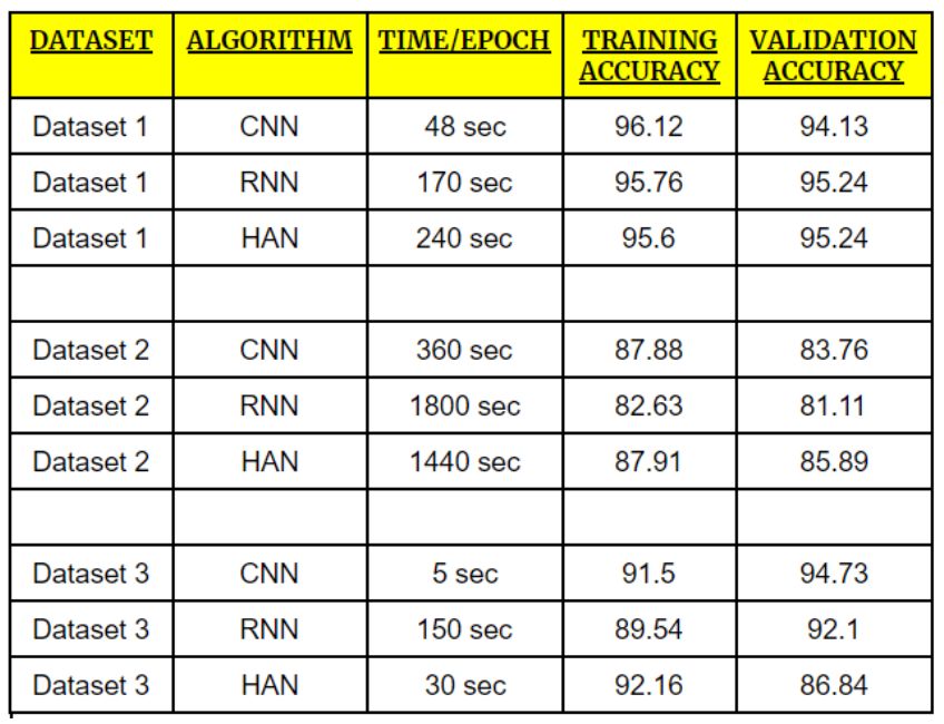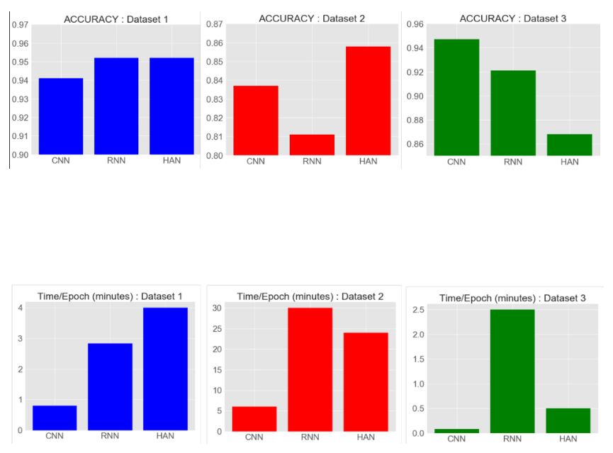 CNN模型在训练时间方面优于其他两个模型(RNN和HAN),但是如果我们拥有较大的数据集,HAN比CNN和RNN表现更好。