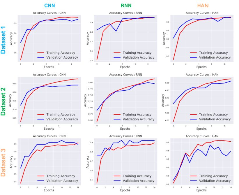 基于上述图表,CNN取得了良好的验证准确率以及高度的一致性,RNN和HAN也实现了高准确性,但在所有数据集中它们并不具有一致性。
