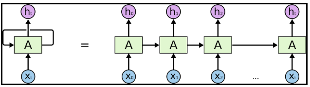 RNN是一系列的神经网络节点,它们像链条一样彼此连接。每个节点都将信息传递给下一节点。如果你想深入了解其内部机制,我强烈推荐Colah的博客。