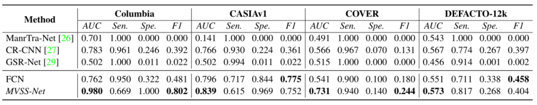 表 3:与SOTA方法对比图像级分类指标(CASIAv2训练,公共数据集测试,阈值0.5)
