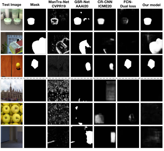 注意到特定图像区域是否存在篡改与其语义内容并不存在必然联系。而现有的语义分割网络通常着力于捕获特定训练集所蕴含的语义信息,使得网络往往过度依赖数据集而降低其泛化能力。之前的研究[2]已经显示,在CASIAv2数据集[3]上训练的DeepLabv2分割网络,在与CASIAv2同源的CAISAv1数据集上表现良好,而在非同源的COVER数据集[4]上表现较差。此外,现有SOTA方法和评价指标仅关注篡改图像的像素级检测结果。这种评价机制并未考虑检测方法对于真实、未篡改图片的响应情况。事实上,现有方法均存在较为严重的误报现象,严重影响了它们在实际应用场景中的可用性。