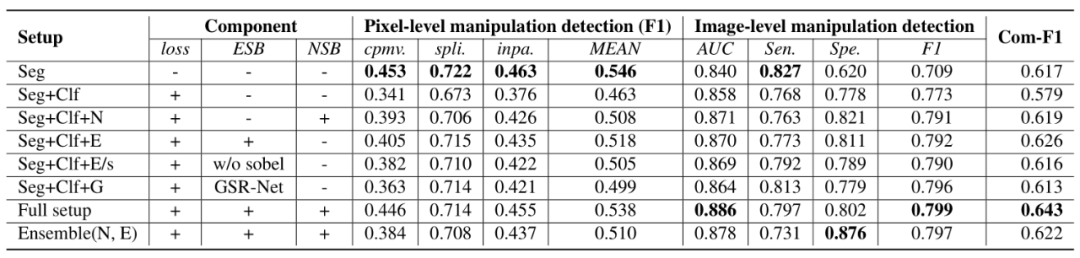 表 1:MVSS-Net消融实验,(DEFACTO-84k训练,DEFACTO-12k测试)